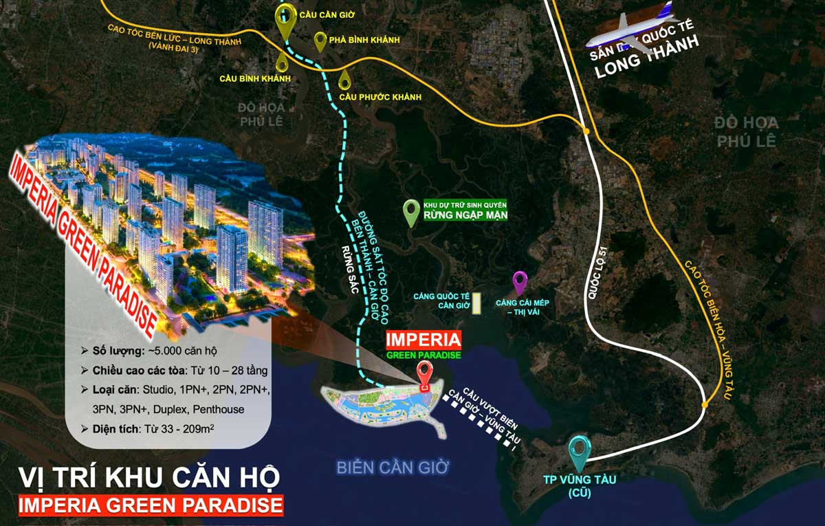 Imperia Green Paradise Cần Giờ nằm tại xã Long Hòa, thị trấn Cần Thạnh, huyện Cần Giờ, TP. Hồ Chí Minh.Tọa lạc nơi cực Nam TP. HCM – nơi ranh giới giữa thành thị và đại dương được xóa nhòa bởi nét chấm phá táo bạo của quy hoạch hiện đại. Imperia Green Paradise Cần Giờ sở hữu vị trí độc nhất vô nhị: ba mặt giáp biển Đông – một mặt giáp rừng nguyên sinh – một đặc ân hiếm có mà ít khu đô thị nào tại Việt Nam có được.