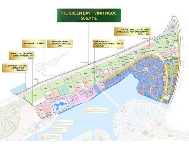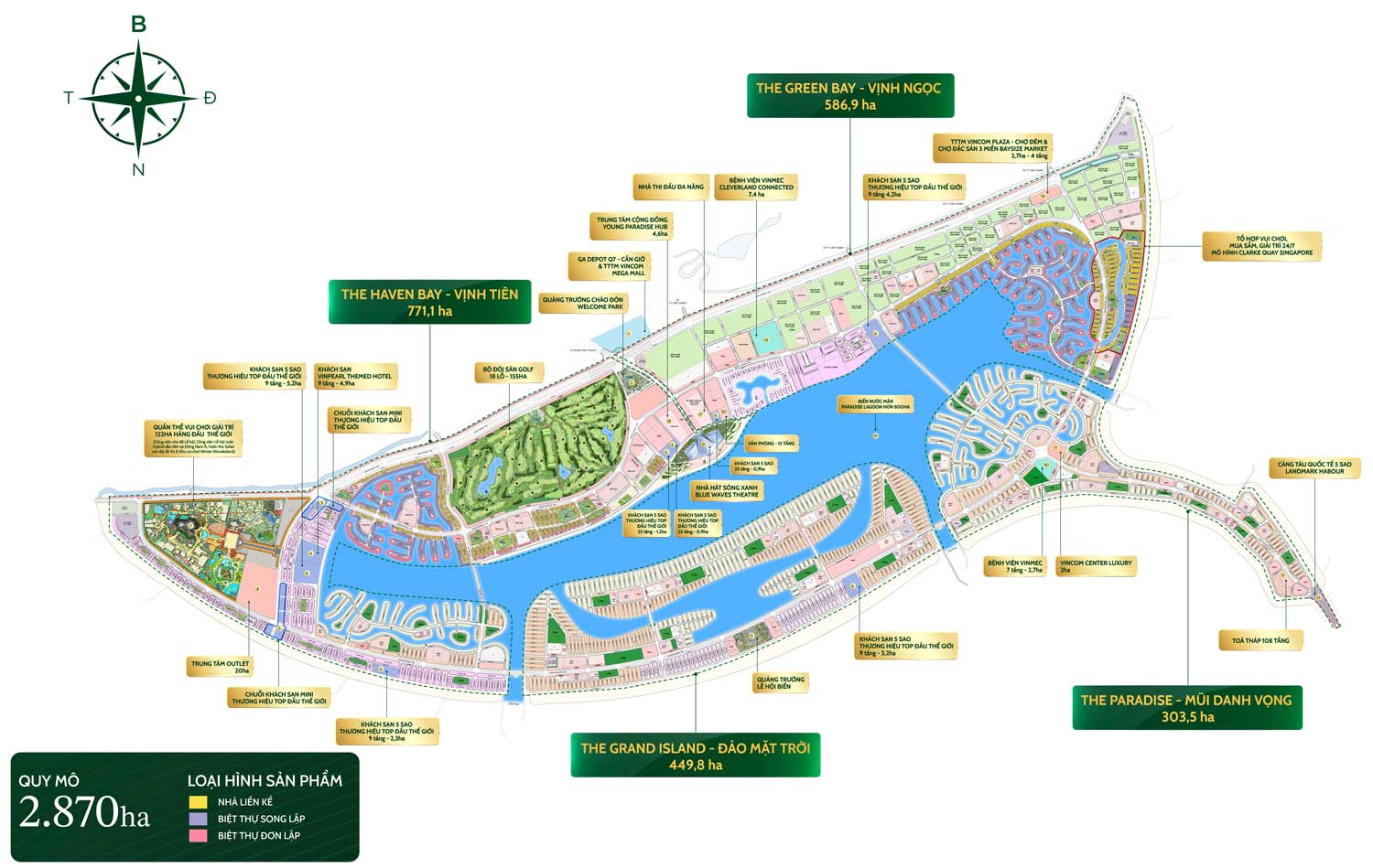 Trả lời: Dự án gồm 4 phân khu chính: The Haven Bay (Vịnh Tiên) - vui chơi giải trí & nghỉ dưỡng; The Green Bay (Vịnh Ngọc) - sinh thái, văn hóa & cư dân; The Paradise (Mũi Danh Vọng) - tài chính, thương mại cao tầng; The Grand Island (Đảo Mặt Trời) - nghỉ dưỡng cao cấp. Ngoài ra còn một phân khu trung tâm cảnh quan (khu E) chủ yếu là mặt nước & cây xanh.