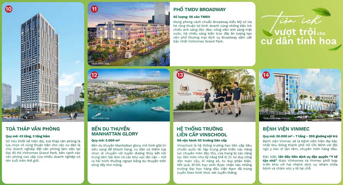 Nổi bật tại Vinhomes Grand Park là Công viên ánh sáng rộng 36ha, cùng hệ thống trường học Vinschool, bệnh viện quốc tế Vinmec, chuỗi siêu thị Vinmart, trung tâm thương mại Vincom và xe buýt điện VinBus, mang đến chuẩn sống hiện đại, tiện nghi và bền vững cho cư dân.